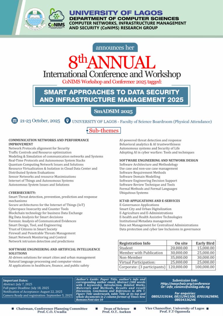 CONIMS Conference is a forum that allows researchers and practitioners from the fields related to computer networks. network security and infrastructure management, IT policies, Cloud Computing and Big Data to present their novel research findings and results. Common to all these fields is the concept of security in this digital world. The relevance of research findings, results obtained, systems developed and techniques adopted in these research fields for both the industries and government cannot be overemphasized. The eighth edition tagged “Smart Approaches to Data Security and Infrastructure Management 2025 (SmADSIM 2025)” promises to be very insightful.